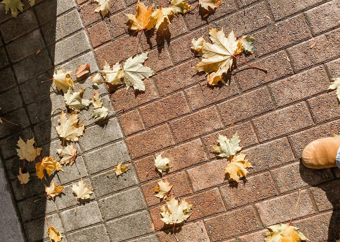 We pass each other, our feet treading the red cobblestone, yet none of them stare in wonder around at the beauty of the trees. Fallen leaves, all shades of red and orange and yellow, litter the stones beneath us. I stop for a picture; they continue on without pause.